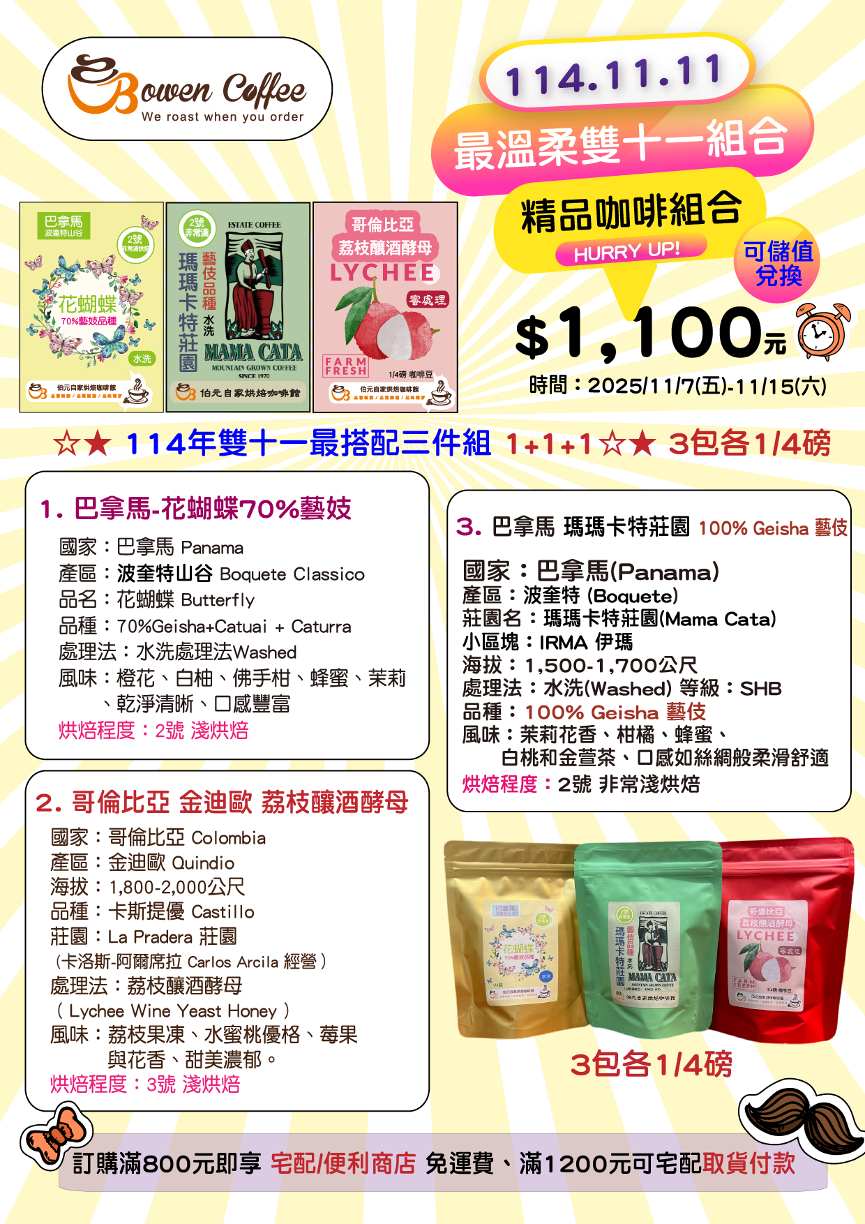 三款高品質、高水準咖啡豆各 1/4 磅包裝