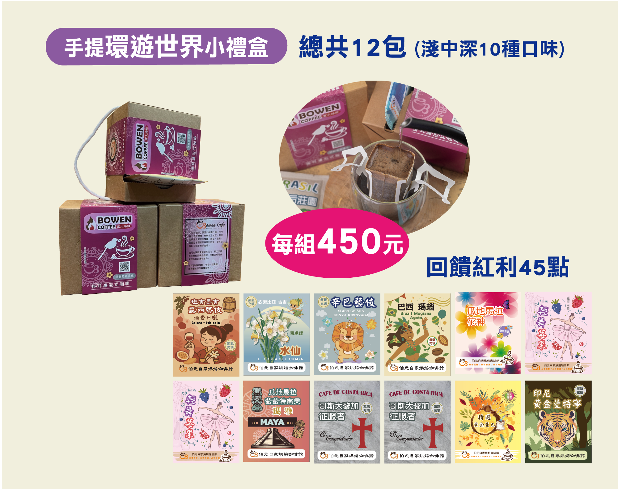 【伯元馬年特惠】濃郁厚實組 15入禮盒:《三種口味各5包》哥斯大黎加-征服者 / 精選黃金曼巴 / 黃金曼特寧 【充氮氣濾掛式咖啡掛耳包】說明介紹:伯元咖啡的充氮氣濾掛咖啡,從挑選咖啡豆到包.....