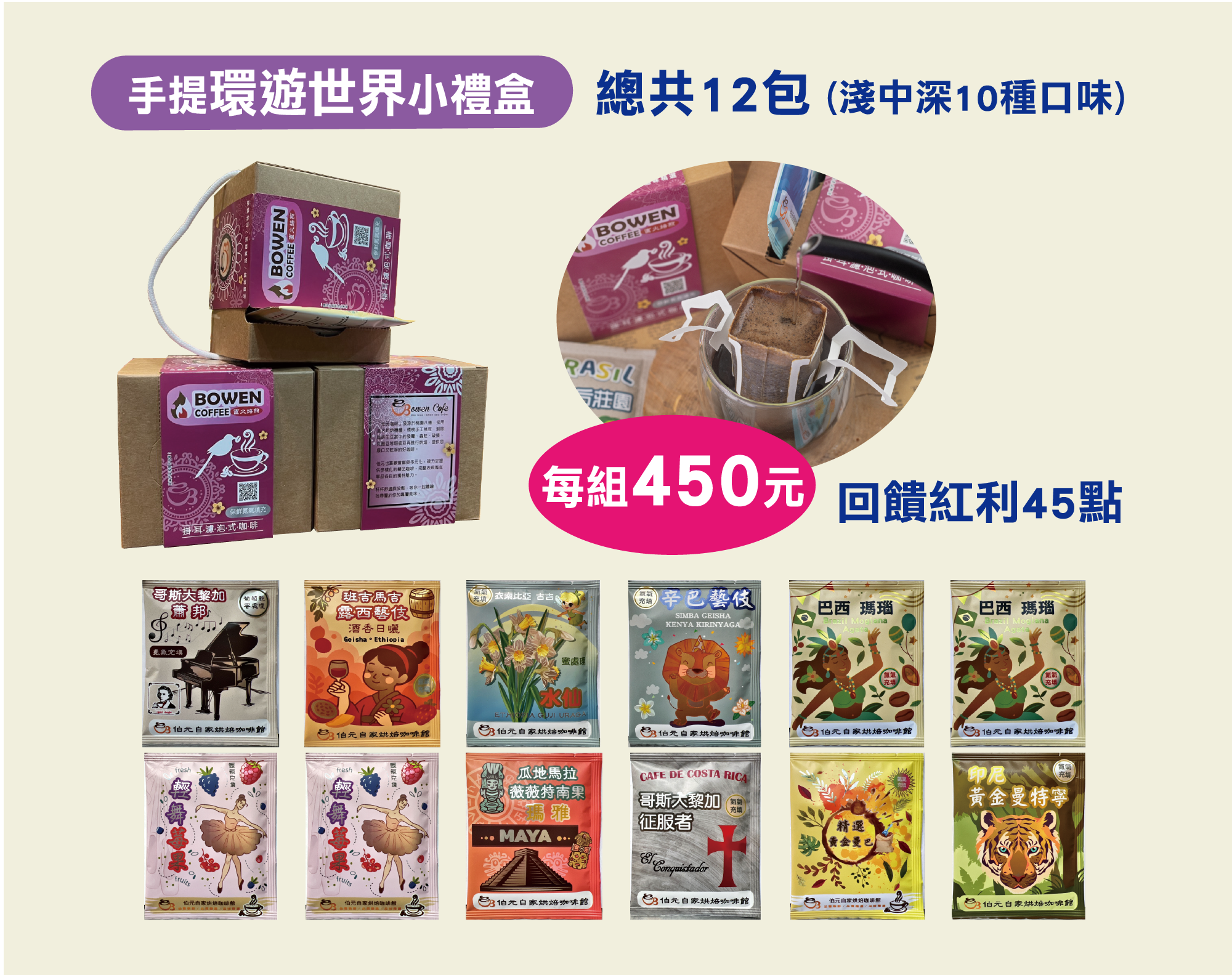 伯元充氮氣濾掛式咖啡【伯元咖啡】充氮氣濾掛咖啡手提小禮盒《10款不同口味》綜合12小包組合:450元、官方網站回饋45點 《多件優惠》5盒以上:每盒420元10盒以上:每盒380元 .....